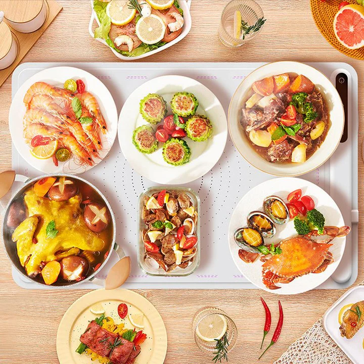 Mit 17 Temperatureinstellungen, die von 20°C bis 100°C reichen, können Sie jedes Gericht perfekt zubereiten. Die geräumige Fläche von 608x378 mm kann mehrere Behälter gleichzeitig aufnehmen. Ein 6-Stunden-Timer mit automatischer Abschaltung und ein integrierter Kindersicherung sorgen für einen sorgenfreien Betrieb.