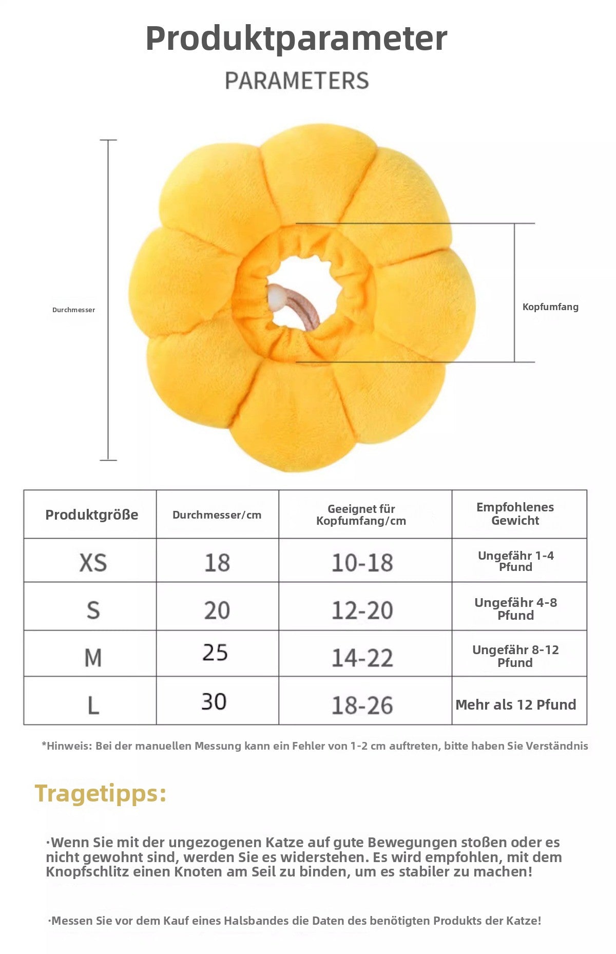 Spezifikationen: Größe XS [Halsabdeckungsdurchmesser 18 cm ist für ca. 1-2 kg geeignet], Größe S [Halsabdeckungsdurchmesser 20 cm ist für ca. 4-4 kg geeignet], Größe M [Halsabdeckungsdurchmesser 25 cm ist für ca. 8-6 kg geeignet], Größe L [Halsabdeckungsdurchmesser 30 cm ist für mehr als 6 kg geeignet]