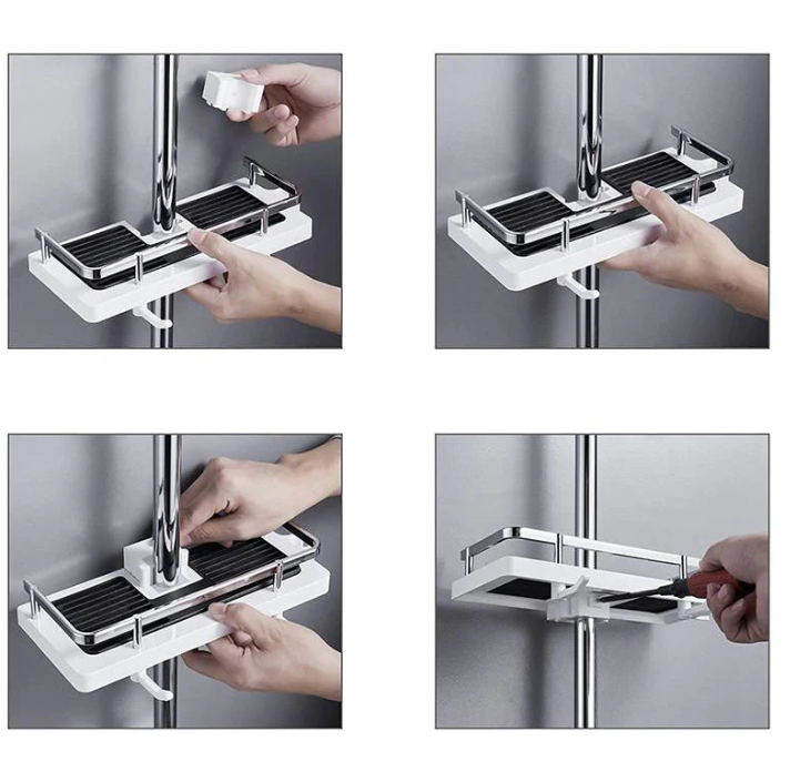 Hergestellt aus hochwertigen, wasserfesten Materialien, hält das Regal problemlos Feuchtigkeit und täglichem Gebrauch stand. Die unkomplizierte Montage ohne Bohren macht es perfekt für Mietwohnungen oder schnelle Umgestaltungen. Es kann flexibel an der Duschstange oder Wand angebracht werden und passt sich deinen Anforderungen an.