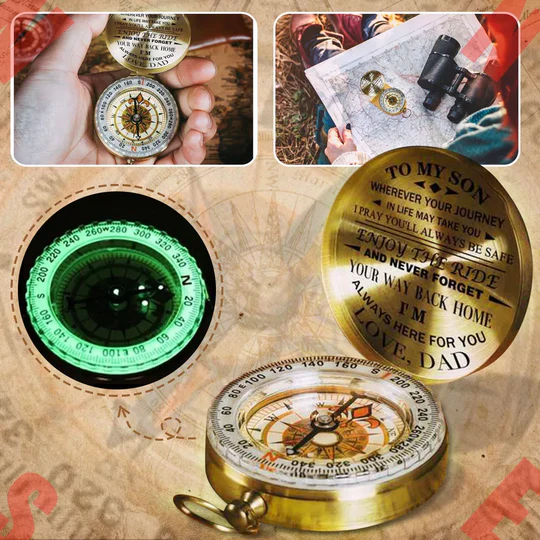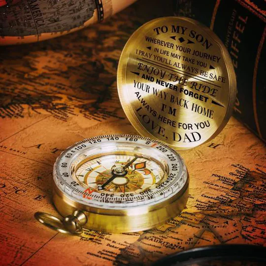 Dieser personalisierte Kompass, der liebevoll von Vater zu Sohn graviert wurde, inspiriert ihn, stark und mutig zu bleiben und niemals seinen Weg nach Hause zu vergessen. Aufgrund seiner kompakten Größe und des geringen Gewichts kann er ihn problemlos auf seinen Reisen mitnehmen oder als Andenken Ihrer Liebe aufbewahren. Seine feine Verarbeitung und die antike Politur verleihen ihm eine anspruchsvolle, zeitlose Ausstrahlung. Ob er nun auf einem Schreibtisch oder in der Tasche aufbewahrt wird, dieser Kompass ist ein praktisches Werkzeug für die Reisen des Lebens und ein durchdachtes Geschenk.